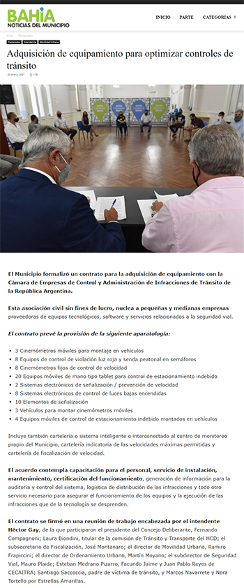 El contrato se firmó en una reunión de trabajo encabezada por el intendente Héctor Gay, de la que participaron el presidente del Concejo Deliberante, Fernando Compagnoni; Laura Biondini, titular de la comisión de Tránsito y Transporte del HCD; el subsecretario de Fiscalización, José Montanaro; el director de Movilidad Urbana, Ramiro Frapiccini; el director de Ordenamiento Urbano, Martín Moyano; el subdirector de Seguridad Vial, Mauro Plaide; Esteban Medrano Pizarro, Facundo Jaime y Juan Pablo Reyes de CECAITRA; Santiago Saccoccia, padre de víctima de tránsito, y Marcos Navarrete y Nora Tortello por Estrellas Amarillas.
