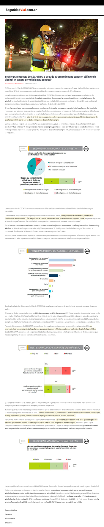 Un relevamiento realizado por el Observatorio Vial de CECAITRA (Cámara que nuclea a las empresas productoras de software vial) arrojó como resultado 6 de cada 4 argentinos desconocen la normativa vial que regula la ingesta de alcohol. La conclusión deriva de un sondeo telefónico que realizó el Observatorio en hogares del AMBA para verificar el comportamiento de los conductores durante las fiestas de diciembre del 2020.