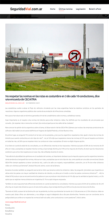 “Más allá de la pluralidad de opiniones en el resultado del sondeo, es importante destacar que la mayoría supone que los argentinos tenemos cierta tendencia a transgredir las normas, más aun en rutas y autopistas que en otro tipo de vías, como podría ser una calle convencional. Desde CECAITRA siempre apelamos a tener conciencia vial, y salir a la calle con respeto, responsabilidad y atención, con el fin de evitar siniestros viales con víctimas que lamentar”, destacó Facundo Jaime, vocero de la Cámara.