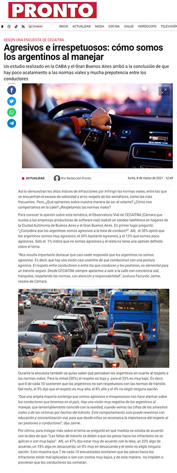 “Nos resulta importante destacar que casi nadie respondió que los argentinos no somos agresivos. Es decir, que hay una visión casi unánime de que conducimos con una postura agresiva. El respeto entre conductores o entre los que conducen y los peatones, es elemental para un tránsito seguro. Desde CECAITRA siempre apelamos a salir a la calle con conciencia vial, tranquilos, respetando las normas, con atención y responsabilidad”, sostuvo Facundo Jaime, vocero de Cámara.