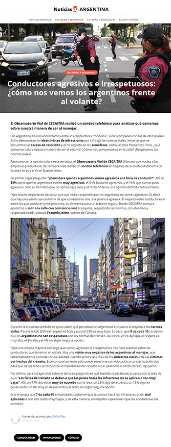 “Nos resulta importante destacar que casi nadie respondió que los argentinos no somos agresivos. Es decir que hay una visión casi unánime de que conducimos con una postura agresiva. El respeto entre conductores o entre los que conducen y los peatones, es elemental para un tránsito seguro. Desde CECAITRA siempre apelamos a salir a la calle con conciencia vial, tranquilos, respetando las normas, con atención y responsabilidad”, sostuvo Facundo Jaime, vocero de Cámara.