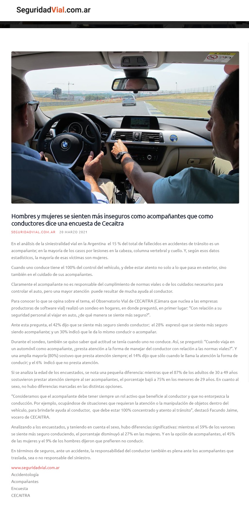 “Consideramos que el acompañante debe tener siempre un rol activo que beneficie al conductor y que no entorpezca la conducción. Por ejemplo, ocupándose de situaciones que requieran la atención o la manipulación de objetos dentro del vehículo, para brindarle ayuda al conductor, que debe estar 100% concentrado y atento al tránsito”, destacó Facundo Jaime, vocero de CECAITRA.
