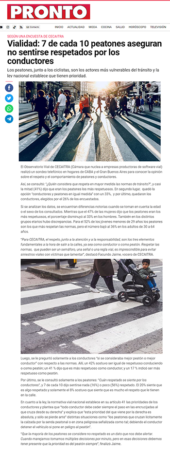El Observatorio Vial de CECAITRA (Cámara que nuclea a empresas productoras de software vial) realizó un sondeo telefónico en hogares de CABA y el Gran Buenos Aires para conocer la opinión sobre el respeto y el comportamiento de peatones y conductores.