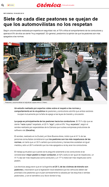 La queja es principalmente de los peatones hacia los conductores. El 70 % dijo que se siente "nada o poco" respetado, el 20 % "algo" y sólo el 8% "muy respetado", según el sondeo realizado por especialistas de la Cámara que nuclea a empresas productoras de software vial (Cecaitra).