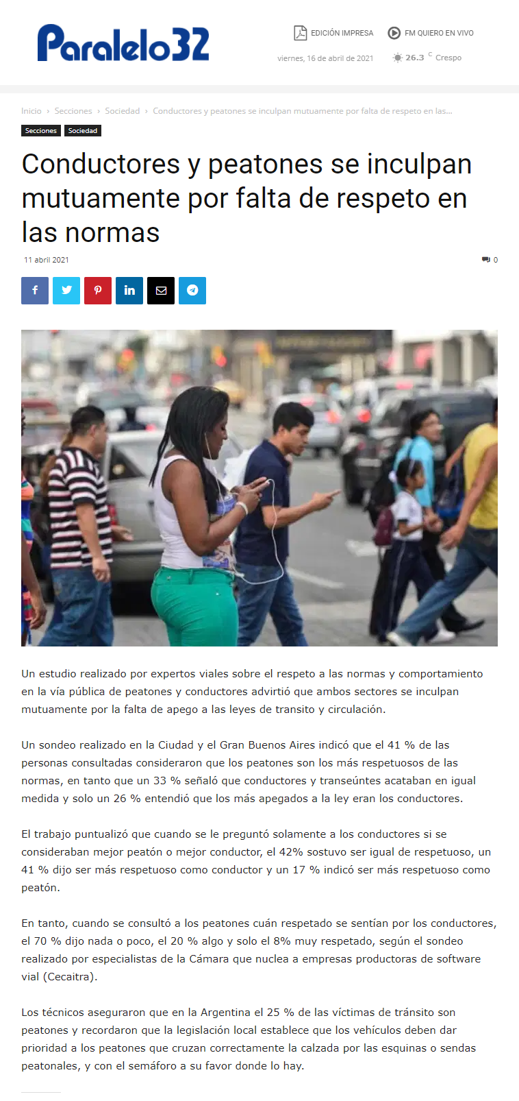Un sondeo realizado en la Ciudad y el Gran Buenos Aires indicó que el 41 % de las personas consultadas consideraron que los peatones son los más respetuosos de las normas, en tanto que un 33 % señaló que conductores y transeúntes acataban en igual medida y solo un 26 % entendió que los más apegados a la ley eran los conductores.