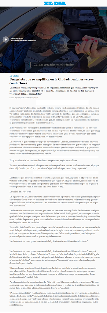 Para la especialista, la imprudencia en La Plata está repartida entre conductores y peatones. “Es muy común ver gente que cruza la calle mandando mensajes por el celular; y a la vez los automovilistas no suelen darle la prioridad a los peatones, como debería ser”, destacó.