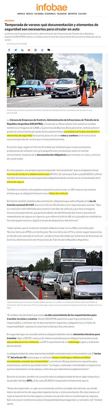 La Cámara de Empresas de Control y Administración de Infracciones de Tránsito de la República Argentina (CECAITRA), a través de su Observatorio Vial, realizó un sondeo telefónico en hogares de CABA y la provincia de Buenos Aires para tener certeza sobre el grado de conocimiento por parte de los automovilistas a propósito de la documentación y elementos de seguridad necesarios para circular en rutas y caminos en el marco de la nueva temporada de verano que iniciará próximamente.