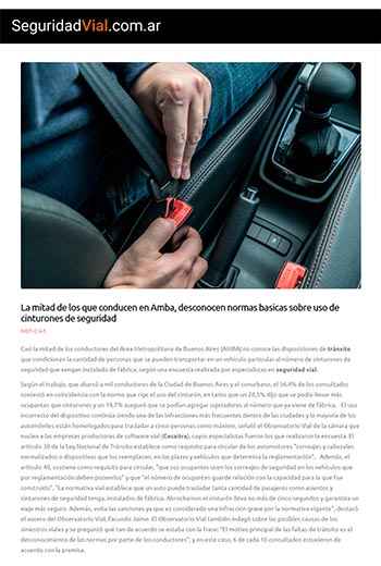 El uso incorrecto del dispositivo continúa siendo una de las infracciones más frecuentes dentro de las ciudades y la mayoría de los automóviles están homologados para trasladar a cinco personas como máximo, señaló el Observatorio Vial de la cámara que nuclea a las empresas productoras de software vial (Cecaitra), cuyos especialistas fueron los que realizaron la encuesta. El artículo 30 de la Ley Nacional de Tránsito establece como requisito para circular de los automotores "correajes y cabezales normalizados o dispositivos que los reemplacen, en las plazas y vehículos que determina la reglamentación". Además, el artículo 40, sostiene como requisito para circular, "que sus ocupantes usen los correajes de seguridad en los vehículos que por reglamentación deben poseerlos" y que "el número de ocupantes guarde relación con la capacidad para la que fue construido". "La normativa vial establece que un auto puede trasladar tanta cantidad de pasajeros como asientos y cinturones de seguridad tenga, instalados de fábrica. Abrocharnos el cinturón lleva no más de cinco segundos y garantiza un viaje más seguro. Además, evita las sanciones ya que es considerado una infracción grave por la normativa vigente", destacó el vocero del Observatorio Vial, Facundo Jaime.