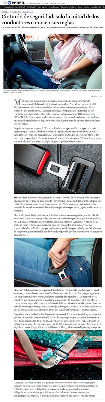 Múltiples son las campañas de concientización que giran en torno a la importancia del uso del cinturón de seguridad. Pero, el uso incorrecto del dispositivo continúa siendo una de las infracciones más frecuentes dentro de las ciudades. Los conductores, ¿Conocen las reglas que regulan la utilización de los cinturones de seguridad? Sobre esta temática, indagó en junio el Observatorio de CECAITRA, la Cámara que nuclea a empresas productoras de software vial, mediante una consulta telefónica en hogares de la Ciudad Autónoma de Buenos Aires y el Gran Buenos Aires.