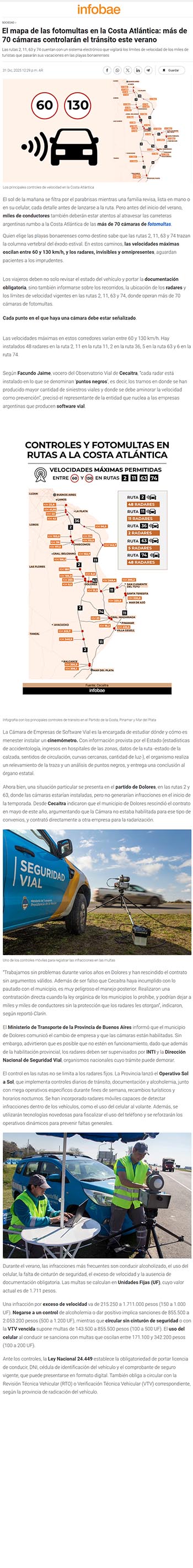 Ahora bien, una situación particular se presenta en el partido de Dolores, en las rutas 2 y 63, donde las cámaras estarían instaladas, pero no generarían infracciones en el inicio de la temporada. Desde Cecaitra indicaron que el municipio de Dolores rescindió el contrato en mayo de este año, argumentando que la Cámara no estaba habilitada para ese tipo de convenios, y contrató directamente a otra empresa para la radarización.