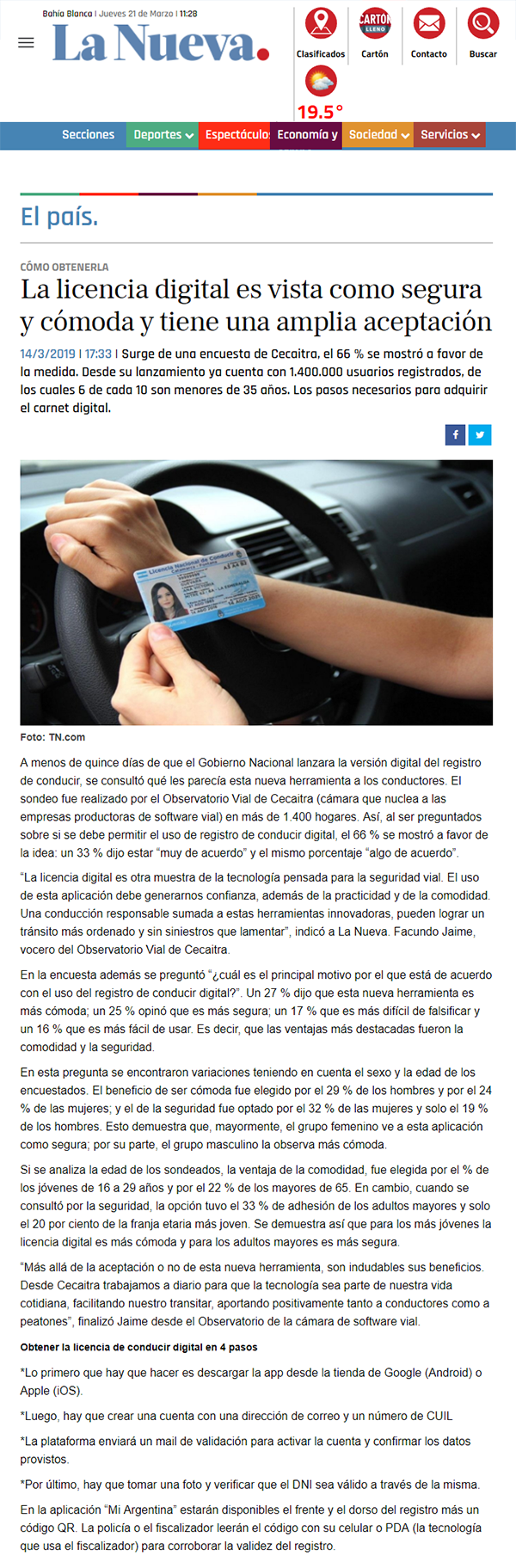 A menos de quince días de que el Gobierno Nacional lanzara la versión digital del registro de conducir, se consultó qué les parecía esta nueva herramienta a los conductores. El sondeo fue realizado por el Observatorio Vial de Cecaitra (cámara que nuclea a las empresas productoras de software vial) en más de 1.400 hogares. Así, al ser preguntados sobre si se debe permitir el uso de registro de conducir digital, el 66 % se mostró a favor de la idea: un 33 % dijo estar “muy de acuerdo” y el mismo porcentaje “algo de acuerdo”.