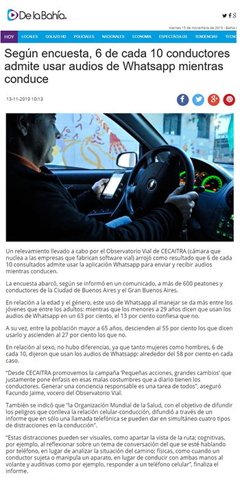 También se indicó que “la Organización Mundial de la Salud, con el objetivo de difundir los peligros que conlleva la relación celular-conducción, difundió a través de un informe que en sólo una llamada telefónica se pueden dar en simultáneo cuatro tipos de distracciones en la conducción”.