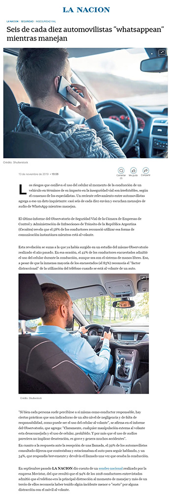 Esta revelación se suma a la que ya había surgido en un estudio del mismo Observatorio realizado el año pasado. En esa ocasión, el 42% de los conductores encuestados admitió el uso del celular durante la conducción, aunque sea con el sistema de manos libres. Eso, a pesar de que la inmensa mayoría de los encuestados (el 85%) reconocía el "factor distraccional" de la utilización del teléfono cuando se está al volante de un auto.