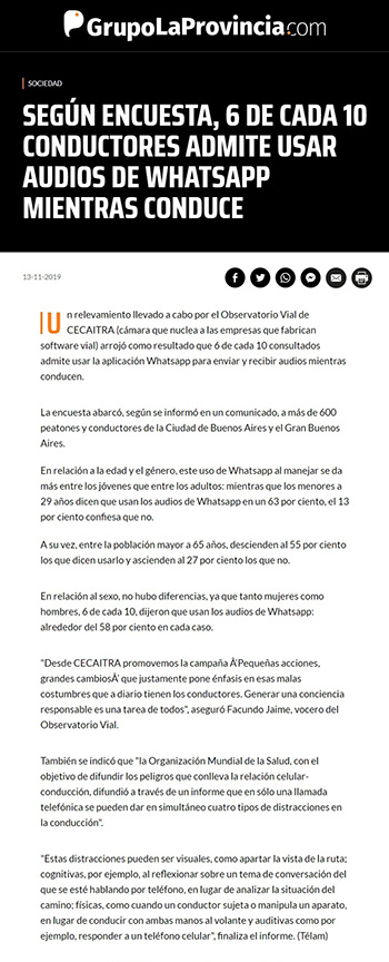 También se indicó que "la Organización Mundial de la Salud, con el objetivo de difundir los peligros que conlleva la relación celular-conducción, difundió a través de un informe que en sólo una llamada telefónica se pueden dar en simultáneo cuatro tipos de distracciones en la conducción".