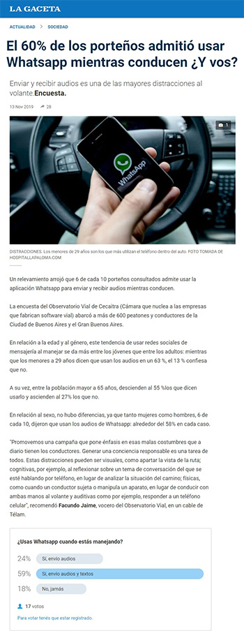 Un relevamiento arrojó que 6 de cada 10 porteños consultados admite usar la aplicación Whatsapp para enviar y recibir audios mientras conducen.