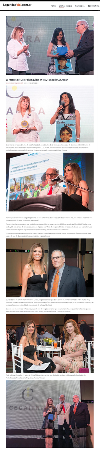 En el marco de la celebración de los 21 años de la constitución de la Cámara de Empresas de Control y Administración de Infracciones de Tránsito de la República Argentina, CECAITRA, Viviam recibió la distinción de manos del decano de los periodistas de tránsito de la Argentina, Ernesto Arriaga y la conductora Viviana Canosa.