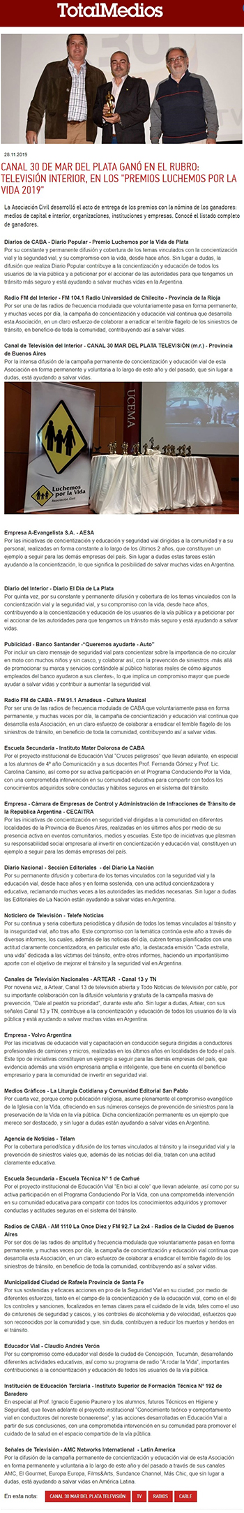 Por quinta vez, por su constante y permanente difusión y cobertura de los temas vinculados con la concientización vial y la seguridad vial, y su compromiso con la vida, desde hace años, contribuyendo a la concientización y educación de los usuarios de la vía pública y a peticionar por el accionar de las autoridades para que tengamos un tránsito más seguro y está ayudando a salvar vidas.