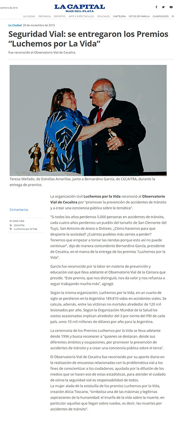 La organización civil Luchemos por la Vida reconoció al Observatorio Vial de Cecaitra por “promover la prevención de accidentes de tránsito y a crear una conciencia pública sobre la temática”.