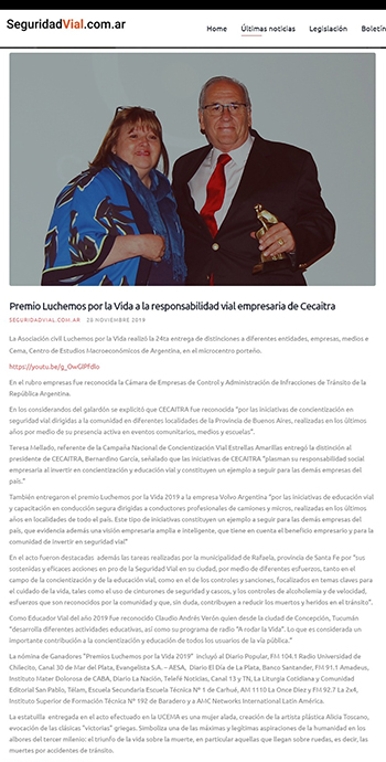 Premio Luchemos por la Vida a la responsabilidad vial empresaria de Cecaitra