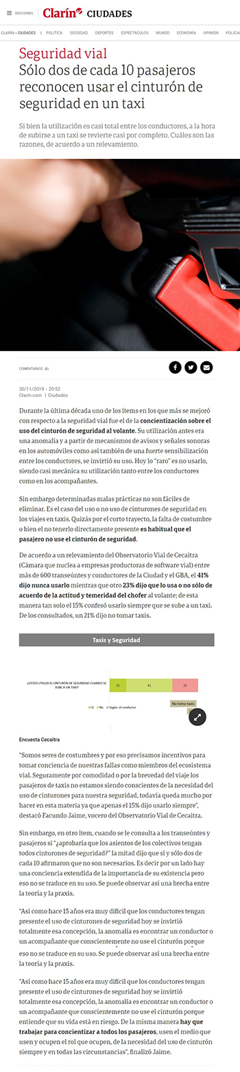 De acuerdo a un relevamiento del Observatorio Vial de Cecaitra (Cámara que nuclea a empresas productoras de software vial) entre más de 600 transeúntes y conductores de la Ciudad y el GBA, el 41% dijo nunca usarlo mientras que otro 23% dijo que lo usa o no sólo de acuerdo de la actitud y temeridad del chofer al volante; de esta manera tan solo el 15% confesó usarlo siempre que se sube a un taxi. De los consultados, un 21% dijo no tomar taxis.