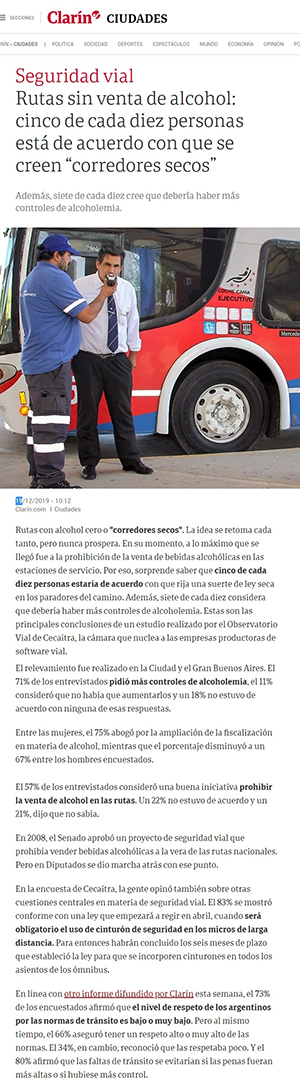 En la encuesta de Cecaitra, la gente opinó también sobre otras cuestiones centrales en materia de seguridad vial. El 83% se mostró conforme con una ley que empezará a regir en abril, cuando será obligatorio el uso de cinturón de seguridad en los micros de larga distancia. Para entonces habrán concluido los seis meses de plazo que estableció la ley para que se incorporen cinturones en todos los asientos de los ómnibus.