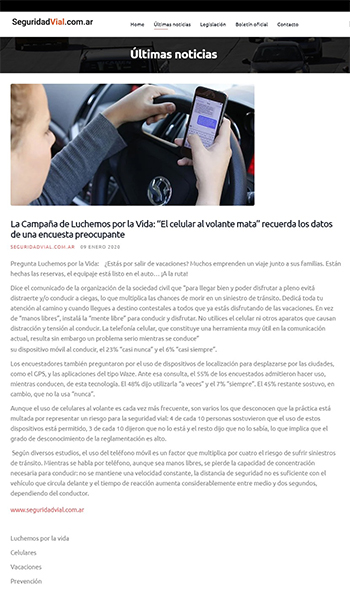 Dice el comunicado de la organización de la sociedad civil que “para llegar bien y poder disfrutar a pleno evitá distraerte y/o conducir a ciegas, lo que multiplica las chances de morir en un siniestro de tránsito. Dedicá toda tu atención al camino y cuando llegues a destino contestales a todos que ya estás disfrutando de las vacaciones. En vez de “manos libres”, instalá la “mente libre” para conducir y disfrutar. No utilices el celular ni otros aparatos que causan distracción y tensión al conducir. La telefonía celular, que constituye una herramienta muy útil en la comunicación actual, resulta sin embargo un problema serio mientras se conduce”