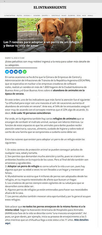 En varias ocasiones se ha dicho que la Cámara de Empresas de Control y Administración de Infracciones de Tránsito de la República Argentina (CECAITRA), que se especializa en nuclear a las empresas creadoras de software viales, realizó un sondeo en más de 1.800 hogares de la Ciudad Autónoma de Buenos Aires y el Gran Buenos Aires sobre el abandono de animales en la época de verano.