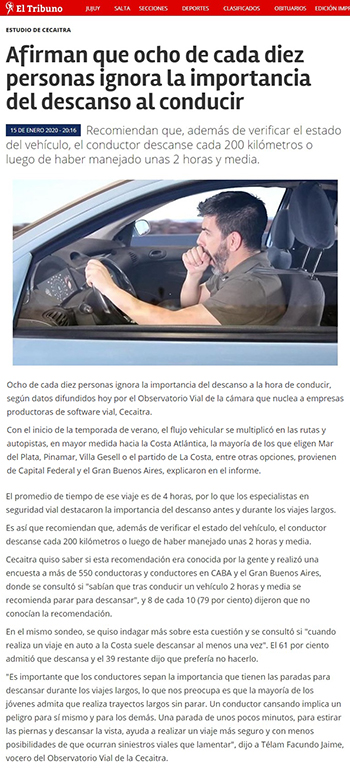"Es importante que los conductores sepan la importancia que tienen las paradas para descansar durante los viajes largos, lo que nos preocupa es que la mayoría de los jóvenes admita que realiza trayectos largos sin parar. Un conductor cansando implica un peligro para sí mismo y para los demás. Una parada de unos pocos minutos, para estirar las piernas y descansar la vista, ayuda a realizar un viaje más seguro y con menos posibilidades de que ocurran siniestros viales que lamentar", dijo a Télam Facundo Jaime, vocero del Observatorio Vial de la Cecaitra.