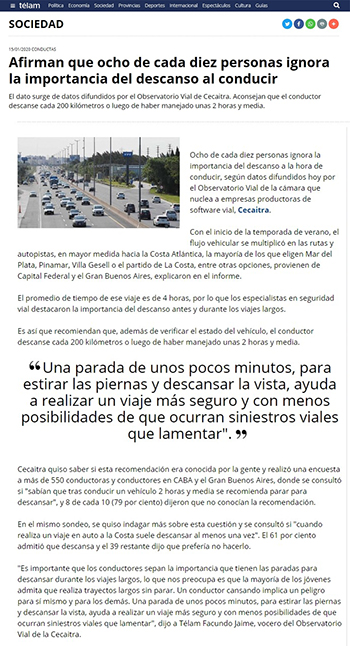 "Es importante que los conductores sepan la importancia que tienen las paradas para descansar durante los viajes largos, lo que nos preocupa es que la mayoría de los jóvenes admita que realiza trayectos largos sin parar. Un conductor cansando implica un peligro para sí mismo y para los demás. Una parada de unos pocos minutos, para estirar las piernas y descansar la vista, ayuda a realizar un viaje más seguro y con menos posibilidades de que ocurran siniestros viales que lamentar", dijo a Télam Facundo Jaime, vocero del Observatorio Vial de la Cecaitra.