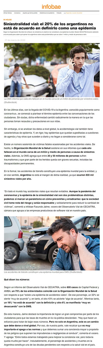 Según un informe del Observatorio Vial de CECAITRA, sobre 600 casos de Capital Federal y AMBA, un 75% de los entrevistados coincide con la Organización Mundial de la Salud con respecto a que “existe una epidemia de accidentes viales”. De ese porcentaje, un 32% se siente “muy de acuerdo” y, en tanto, el otro 43% se advierte “algo de acuerdo”. Mientras tanto, un 19% “no está de acuerdo” con la definición y otro 6% se manifiesta “muy en desacuerdo” con la OMS.