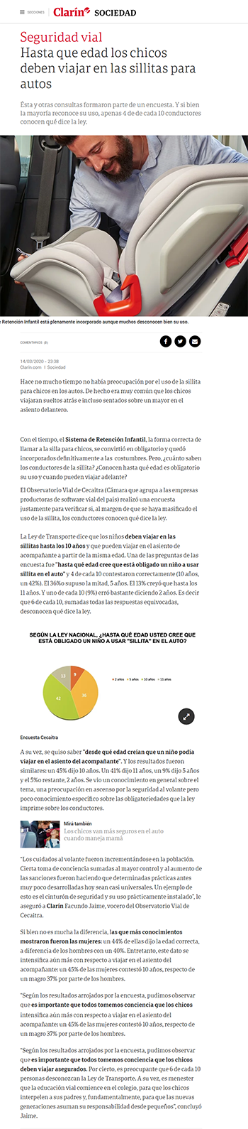 El Observatorio Vial de Cecaitra (Cámara que agrupa a las empresas productoras de software vial del país) realizó una encuesta justamente para verificar si, al margen de que se haya masificado el uso de la sillita, los conductores conocen qué dice la ley.