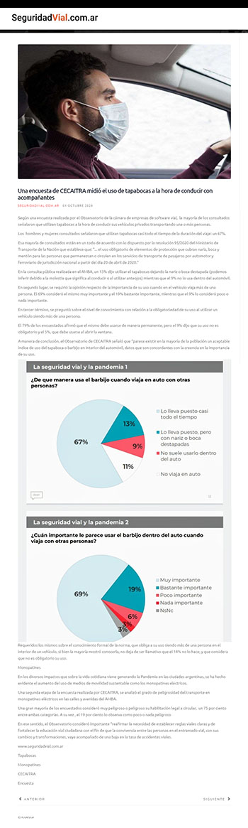 A manera de conclusión, el Observatorio de CECAITRA señaló que “parece existir en la mayoría de la población un aceptable índice de uso del tapaboca o barbijo en interior del automóvil, datos que son concordantes con la creencia en la importancia de su uso.