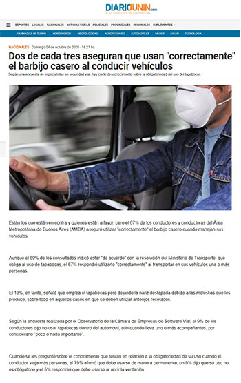 Están los que están en contra y quienes están a favor, pero el 67% de los conductores y conductoras del Área Metropolitana de Buenos Aires (AMBA) aseguró utilizar "correctamente" el barbijo casero cuando manejan sus vehículos.