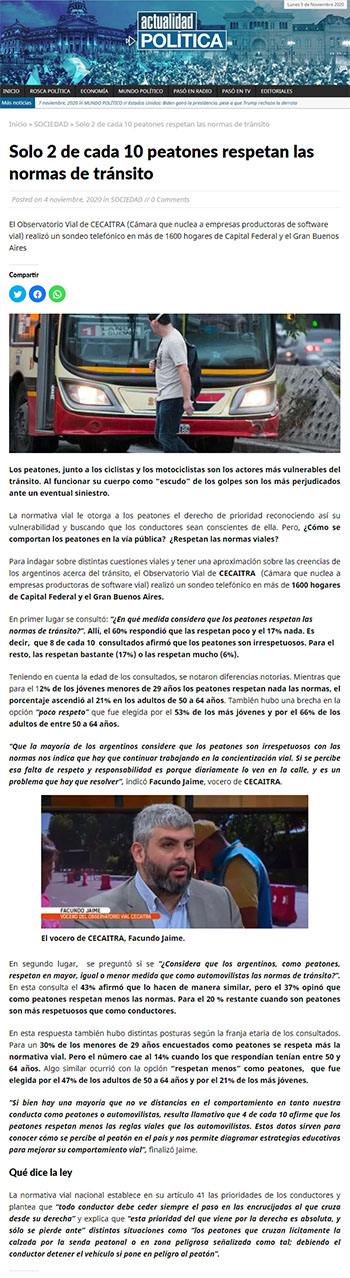 “Que la mayoría de los argentinos considere que los peatones son irrespetuosos con las normas nos indica que hay que continuar trabajando en la concientización vial. Si se percibe esa falta de respeto y responsabilidad es porque diariamente lo ven en la calle, y es un problema que hay que resolver”, indicó Facundo Jaime, vocero de CECAITRA.