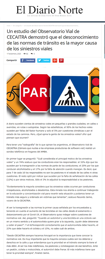 “Evidentemente la mayoría considera que los siniestros viales ocurren por conductores irrespetuosos, alcoholizados o desatentos. Esta mirada nos alienta a continuar trabajando en la educación y concientización vial para revertir esta situación y podamos tener un tránsito más seguro y ordenado sin víctimas que lamentar”, sostuvo Facundo Jaime, vocero de la CECAITRA.